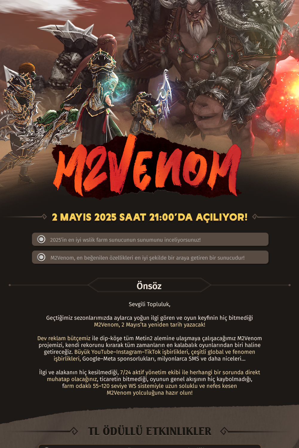 M2Venom, 2 Mayıs 2025 saat 21.00’de açılarak, 2025’in en iddialı ws’lik farm sunucularından biri olmayı hedefliyor. 55-120 seviye aralığında kurulmuş bu sunucu, farm odaklı yapısıyla uzun soluklu bir oyun deneyimi sunuyor. Büyük reklam bütçesi, YouTube, Instagram, TikTok işbirlikleri, global sponsorluklar ve milyonlarca SMS kampanyası ile rekor bir katılım hedefleniyor.